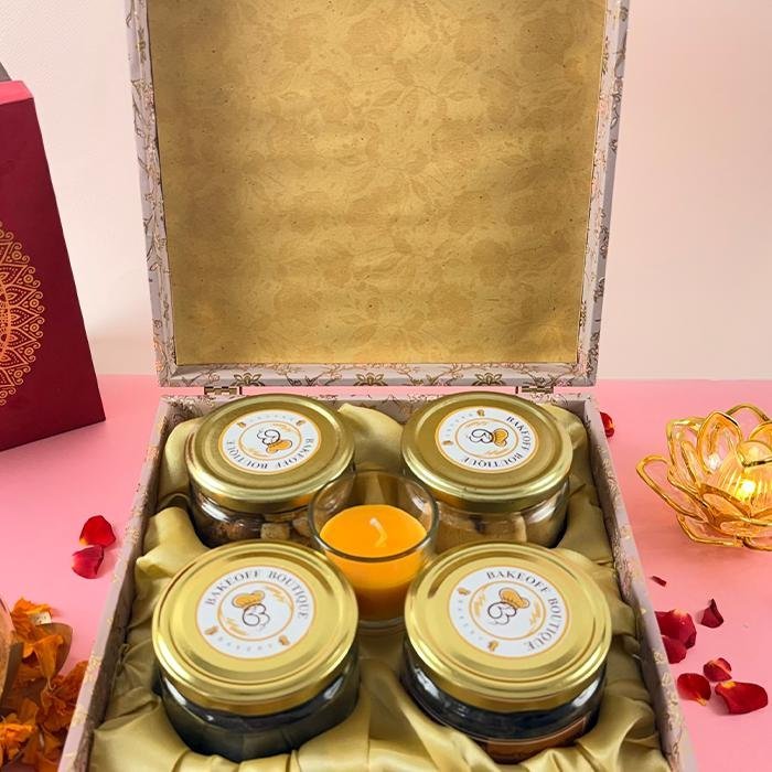 box of butter cookies, box of peri Peri makhana, box of brownie bites, box of chocolate cluster