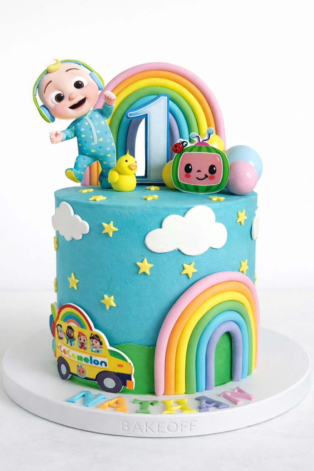 Make your little one’s birthday extra fun with our colourful Cocomelon Theme Birthday Cake from Bakeoff. Designed with the cute Cocomelon character, bright rainbow decorations, clouds, and stars, this cake creates a joyful and playful look perfect for kids’ birthday celebrations.