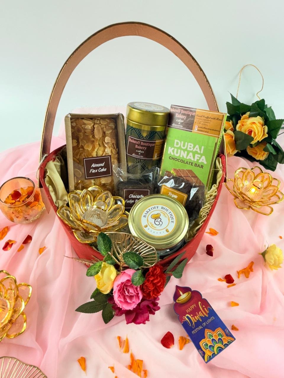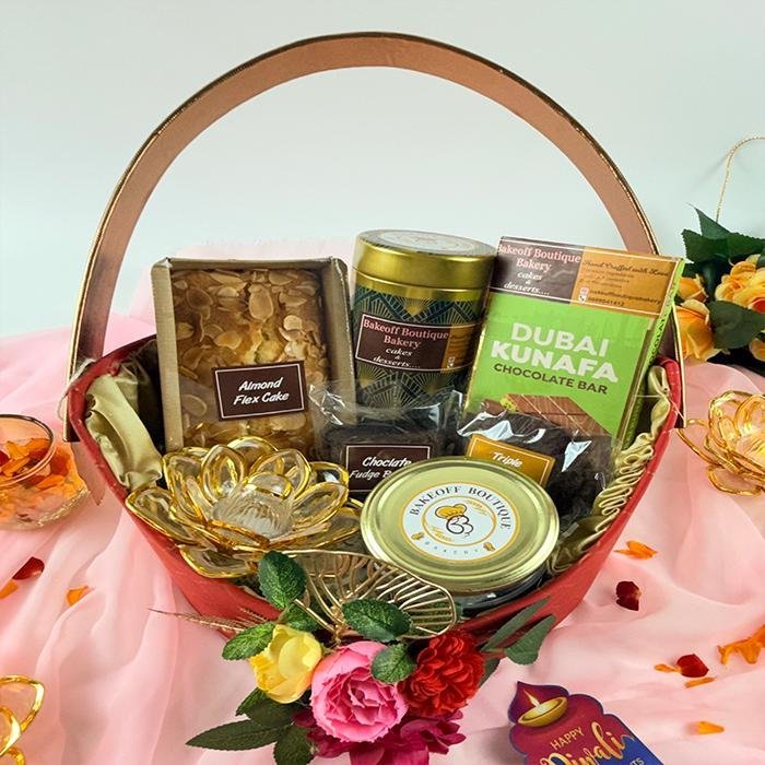 Box of Peri Peri makhana ,box of dry fruit crunch mix , box of Gourmet brownie, almond flex tea cake , triple chocolate cookies,