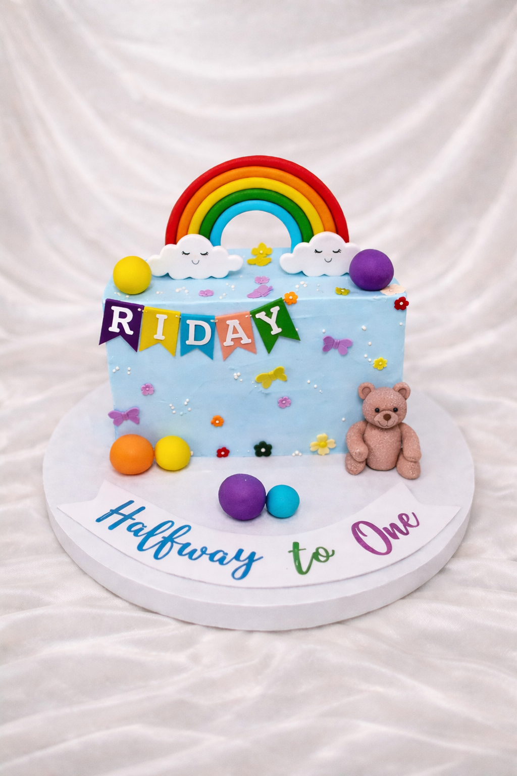 Celebrate your baby’s cute milestone with our beautifully designed Half Birthday Cake from Bakeoff. Decorated with adorable teddy toppers, soft pastel colours, and charming details, this cake is perfect for celebrating your baby turning six months.