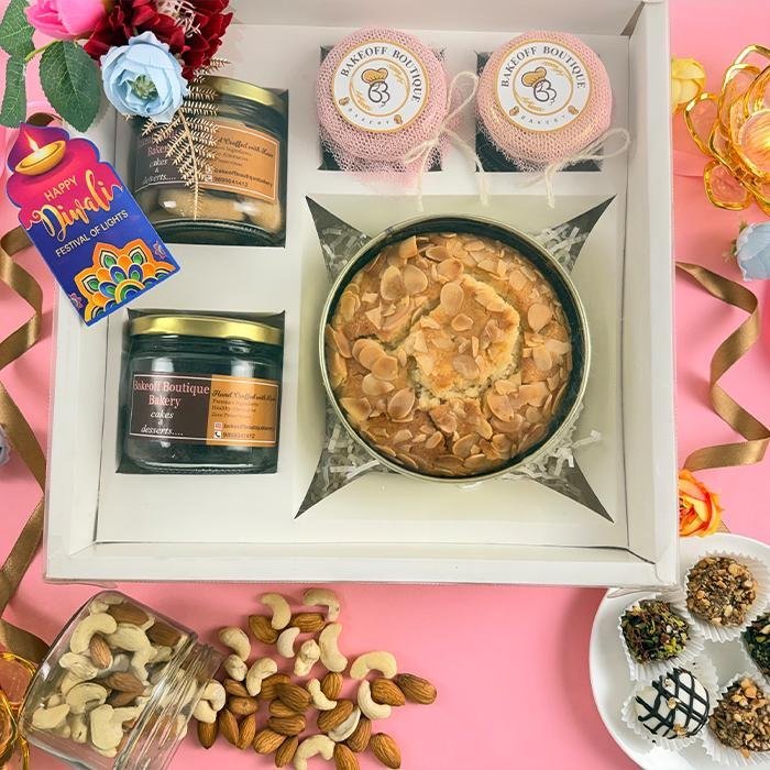 Box of Almond flex travel Cake , Box Of Butter cookies, Box Of Chocolate Cluster , Box of dry nut crunch mix , Box of Brownie bite,
